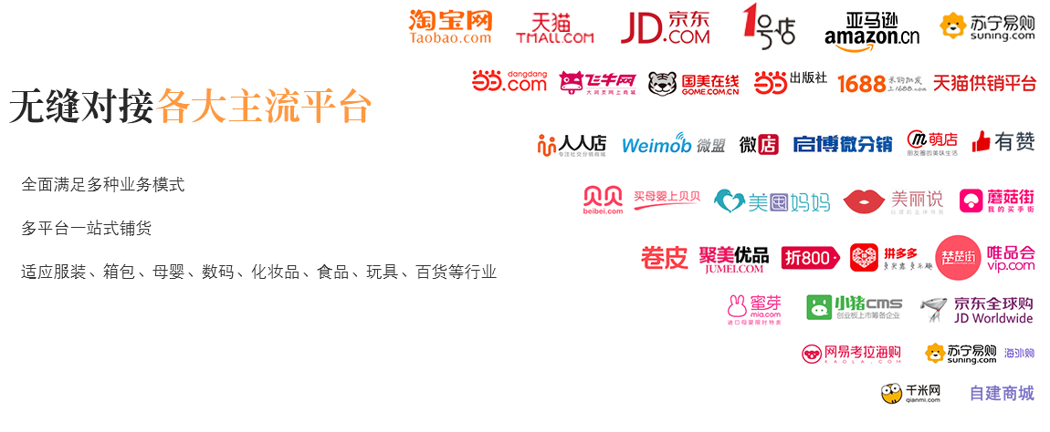 全渠道訂單自動化處理 全渠道訂單統一收訂 訂單智能監控,防止漏單、錯單 電子面單全面對接,每小時3000訂單輕松打 多平臺、多店鋪庫存統一管理 多平臺庫存自動同步,線上線下庫存同步 庫存數據自動更新,避免超賣 智能補貨,及時補貨備貨 各類賬目清晰明了 與供應商、分銷商往來對賬清晰準確 物流、快遞費用自動結算 各平臺運營數據輕松掌握,獨立核算